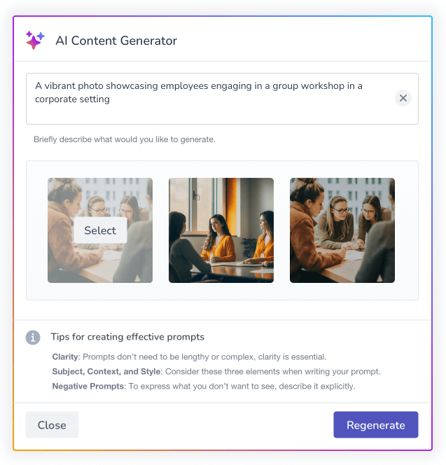 This feature works similarly to our AI text generator. When you select the AI button, Claromentis will prompt you to write a brief description of the image you’d like to create. You’ll then receive a selection of pictures based on this description, all of which will be optimized for the correct image ratio.