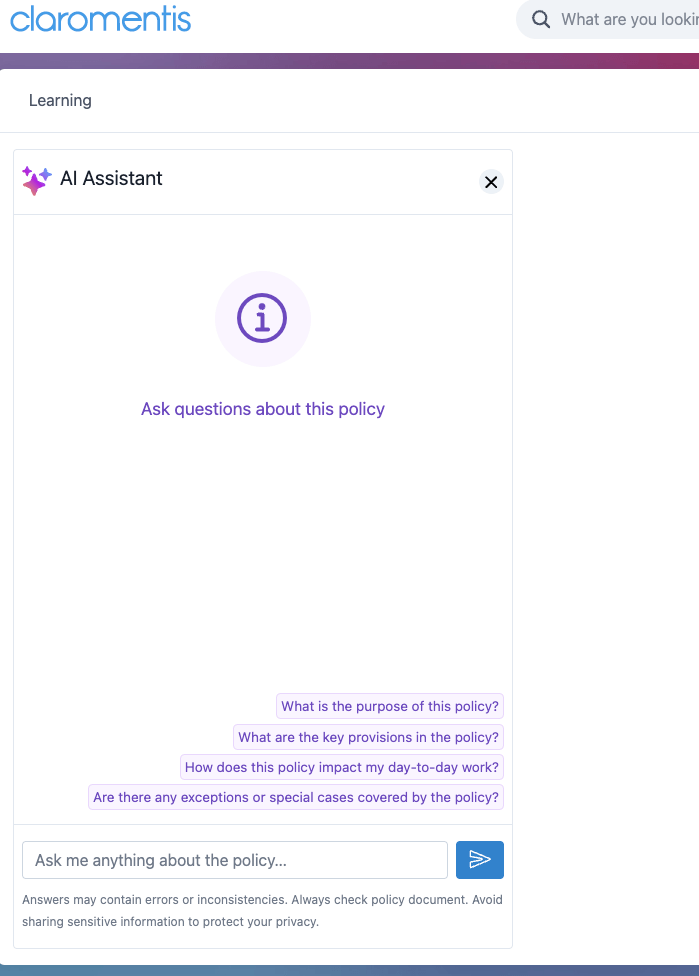 Available exclusively in the Policy Manager application, this intelligent agent pops up whenever a user clicks on a policy. The chatbot ingests the content of the respective policy and generates relevant questions. Users can select one or more of these questions or type in their own to receive a helpful answer or summary.