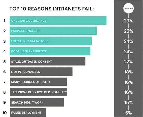 In fact, research reveals that 90% of intranets fail. This comes down to a number of factors, ranging from unclear governance, unclear purpose, disengaged executives and employees, poor user experiences, outdated content and lack of personalisation.