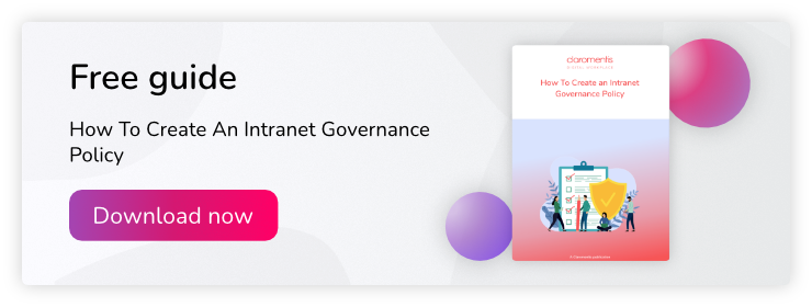 An intranet governance policy normally takes the form of a document but it can also be stored and shared using any information management tool on your intranet. It ultimately acts as a guide to all team members by providing a high-level strategic view of the intranet’s purpose and a detailed overview concerning site management and maintenance.