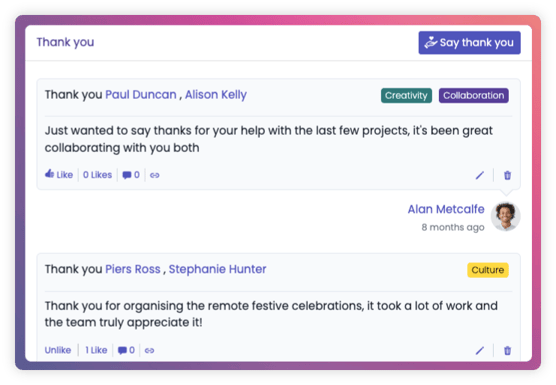 Go one step further and tie individual messages of thanks to your company’s core values and strategies. This will help business leaders keep track of areas of the organisation that are performing well, and which may need improvement.