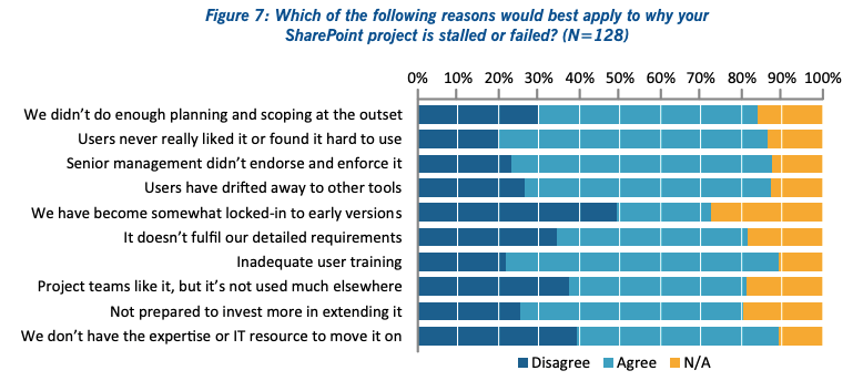 A report by AIIM found that 40% of organizations said their SharePoint implementation was not a success, with inadequate user training (67%), dislike or difficulties with use (66%), and lack of senior management support (64%) cited as the top reasons for failure.