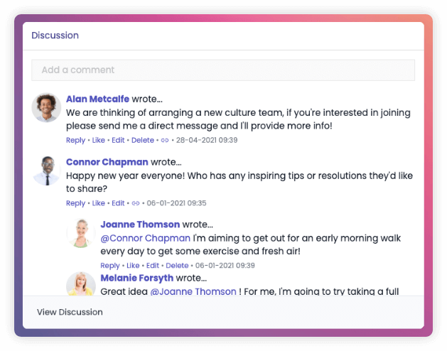 Meanwhile, social media-inspired shared spaces with threaded forums, “likes”, employee recognition tools, and @mention technology creates an environment that streamlines communication and encourages employee engagement.