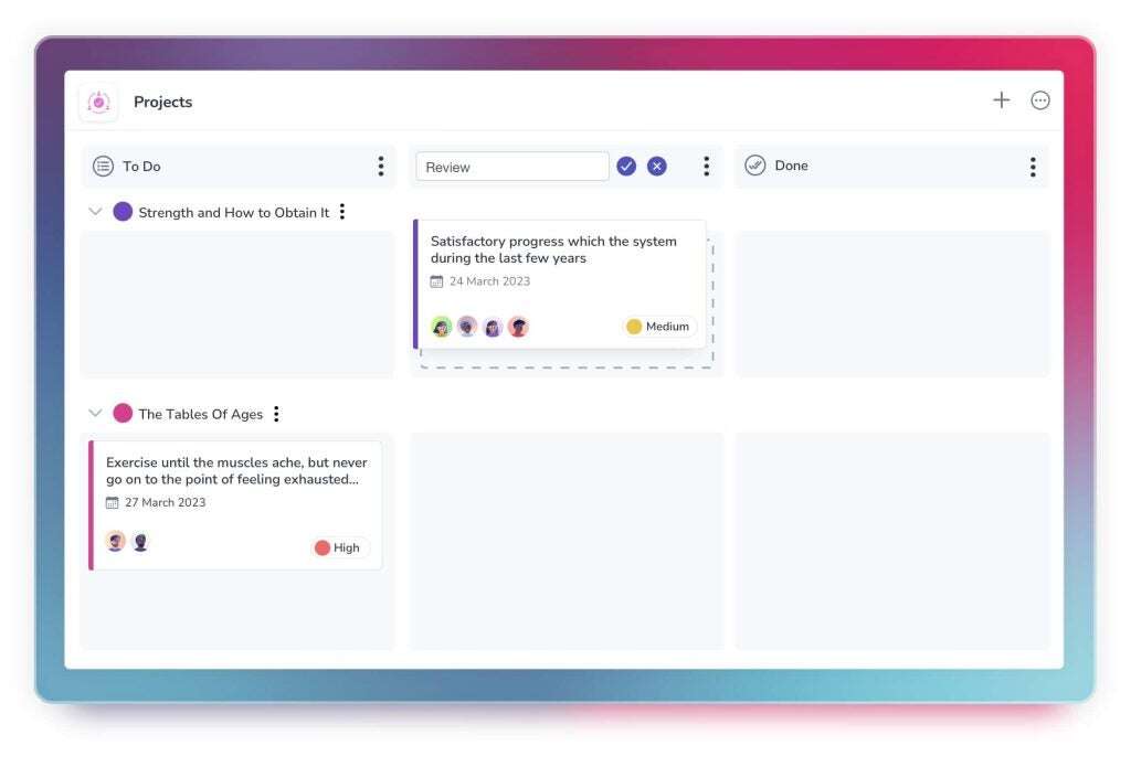 - Kanban boards: A useful visual depiction of task progress and completion across an entire project. Each task is represented by a card, which is moved through different columns representing each stage of a process or workflow