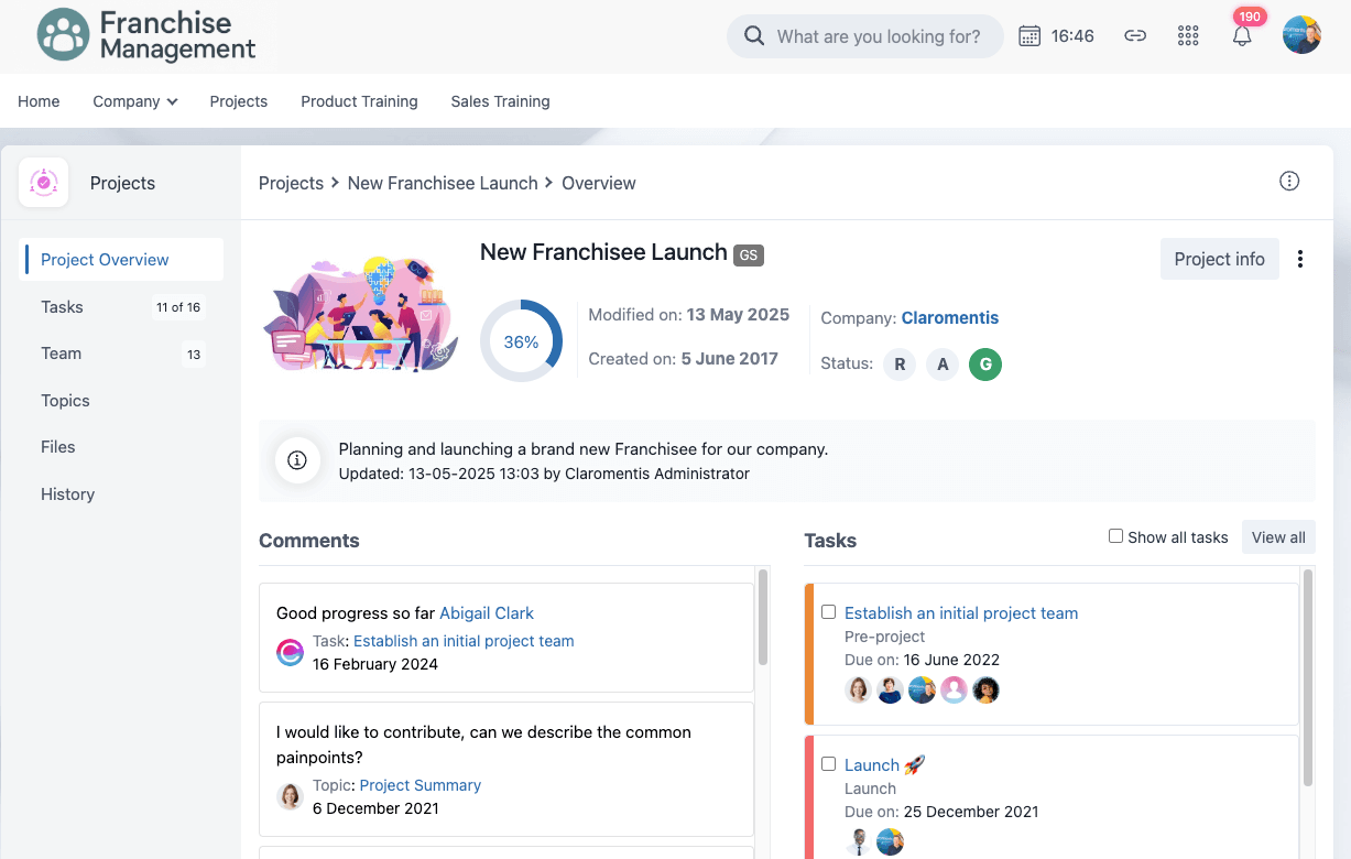 • Onboarding project spaces. Guide your franchisees through the onboarding process with a project management tool. This will help your franchisees understand and prioritize their upcoming tasks. It’ll also enable you to track progress and milestones.