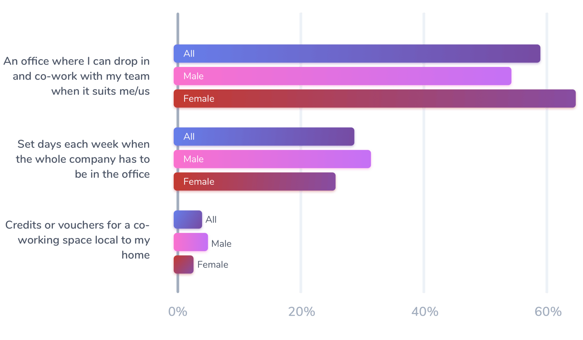 Six in 10 (60%) of those who favour a hybrid arrangement want the flexibility to drop in to the office and co-work with their team when it suits them, while 29% would prefer set days each week when the whole company has to be in the office. The least popular option is credits or vouchers for a co-working space local to their homes: only preferred by 5% of respondents.