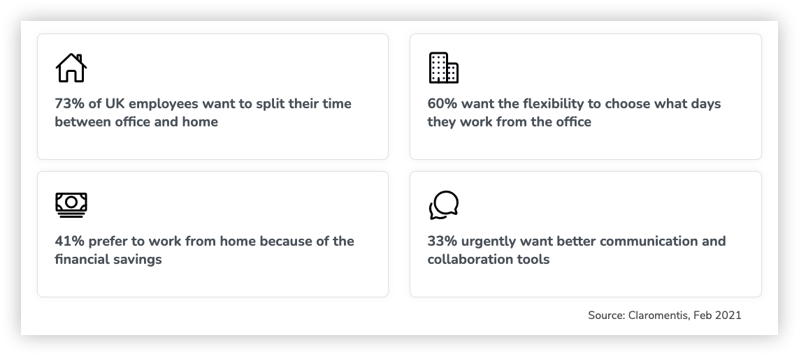 A new survey by digital workplace provider Claromentis reveals that, after lockdown ends and the threat of the pandemic subsides, almost three quarters (73%) of UK knowledge workers want a hybrid arrangement, splitting their time between home and the office.