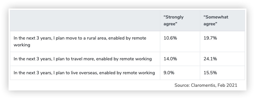 | In the next 3 years, I plan to live overseas, enabled by remote working | 9.0% | 15.5% |