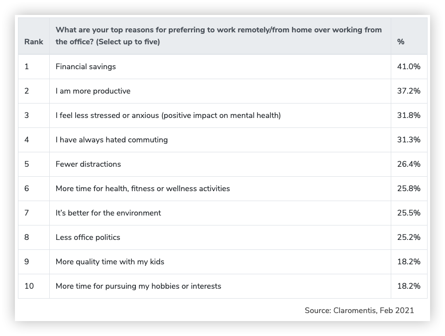 The top 10 reasons for preferring to work remotely over going to the office are listed in order of popularity in the table below: