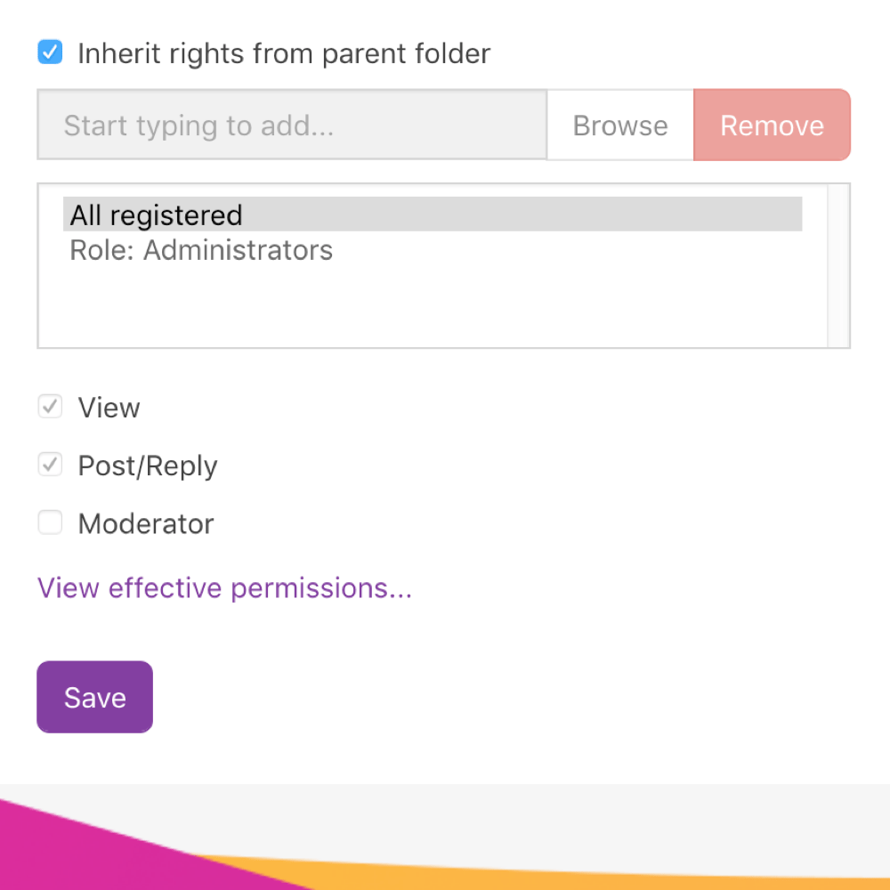 Due to the detailed permission engine pre-built into the intranet platform and present in all intranet applications, varying permission-rights can be distributed to select users. The permission rights are associated with the ability to view, post responses on a forum post or become a moderator. Permissions can be assigned to individual users, groups or users with particular roles.