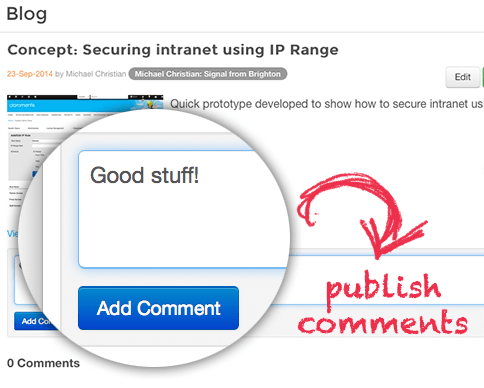 In general, we recommend that commenting on intranet blogs should be instant as participants generally adhere to reasonable standards of language and content, and employees expect to have the ability to respond to posts.