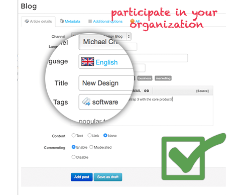 Our corporate blogging software allows for permission-based news channels to be styled as blogs whenever needed. Blogs can also be created for individual departments and projects.