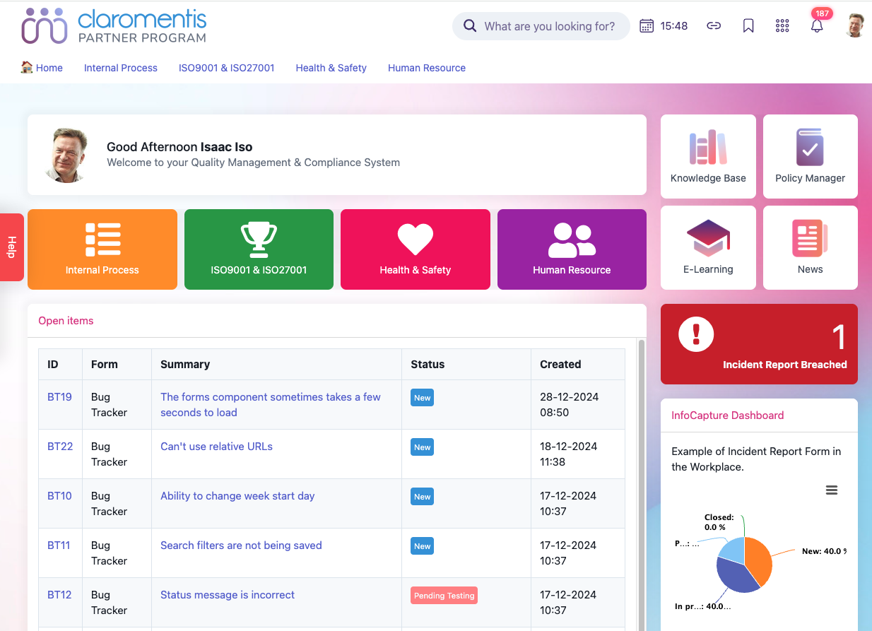 Claromentis is ISO 27001:2022, ISO 9001:2015, and HIPAA certified and centralizes policy management, e-forms, audit trails, and LMS reporting in one integrated digital workplace.
