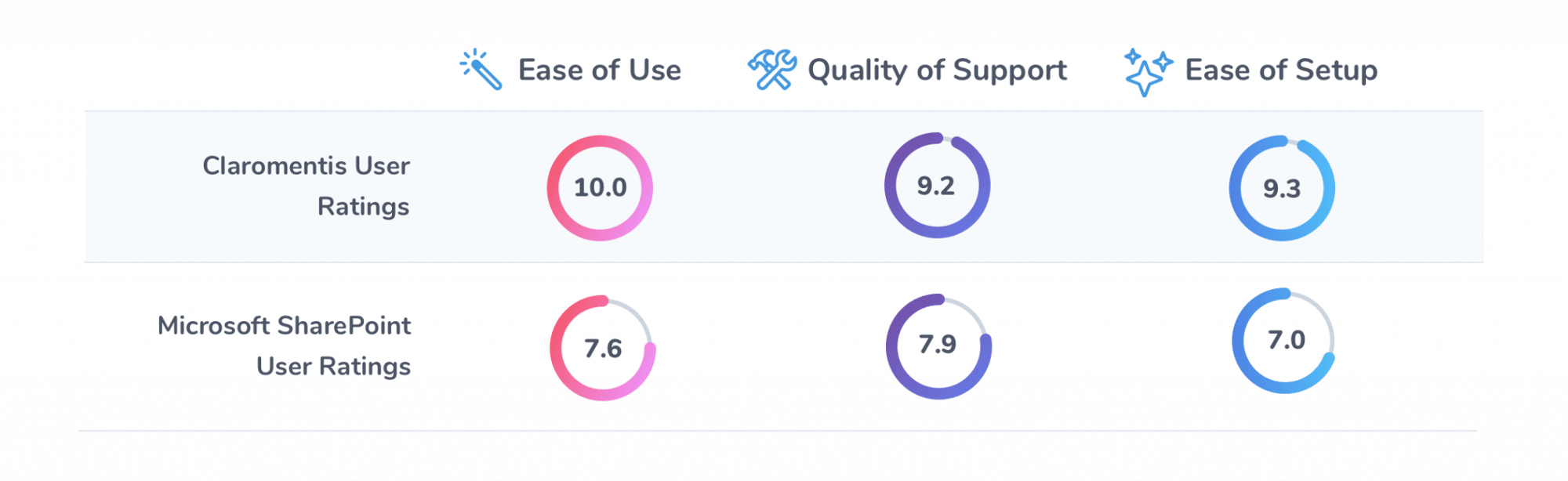 Users rate Claromentis higher for ease of use, ease of setup, and customer support